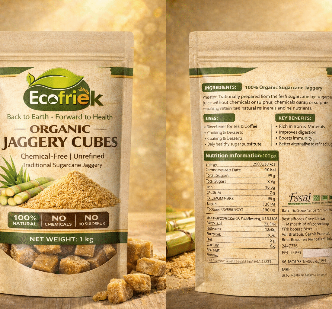 Ecofriek Jaggery is made from pure sugarcane juice using traditional methods to retain its natural sweetness, minerals, and rich taste. It is a healthy alternative to refined sugar and helps support better digestion and immunity.